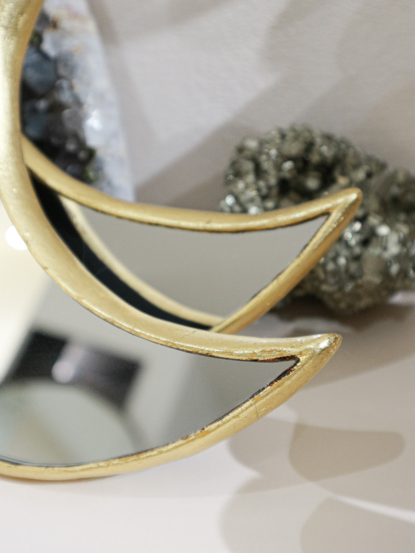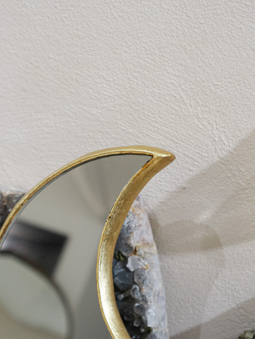 將金箔貼在手工雕刻的木質形狀上。使月亮鏡華麗精緻而美麗